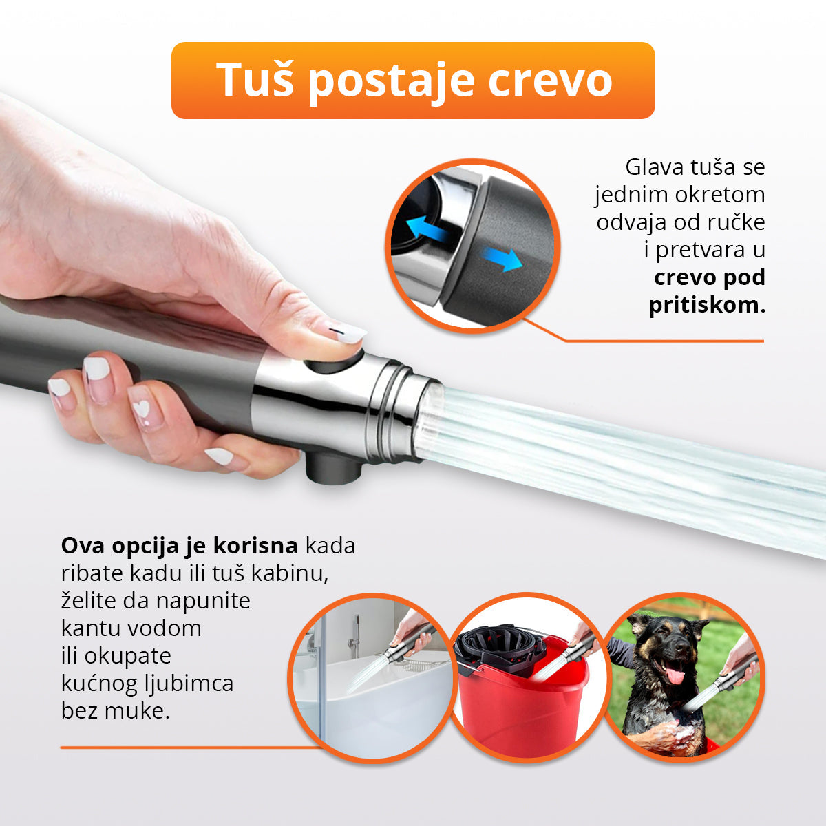 Glava tuša se jednim okretom odvaja od ručke i pretvara u crevo pod pritiskom. Ova opcija je korisna kada ribate kadu ili tuš kabinu, želite da napunite kantu vodom a da to ne traje 5 minuta ili okupate kućnog ljubimca bez muke.