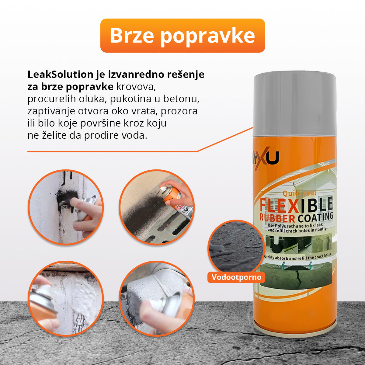 LeakSolution je izvanredno rešenje za brze popravke krovova, procurelih oluka, pukotina u betonu, zaptivanje otvora oko vrata, prozora ili bilo koje površine kroz koju ne želite da prodire voda.