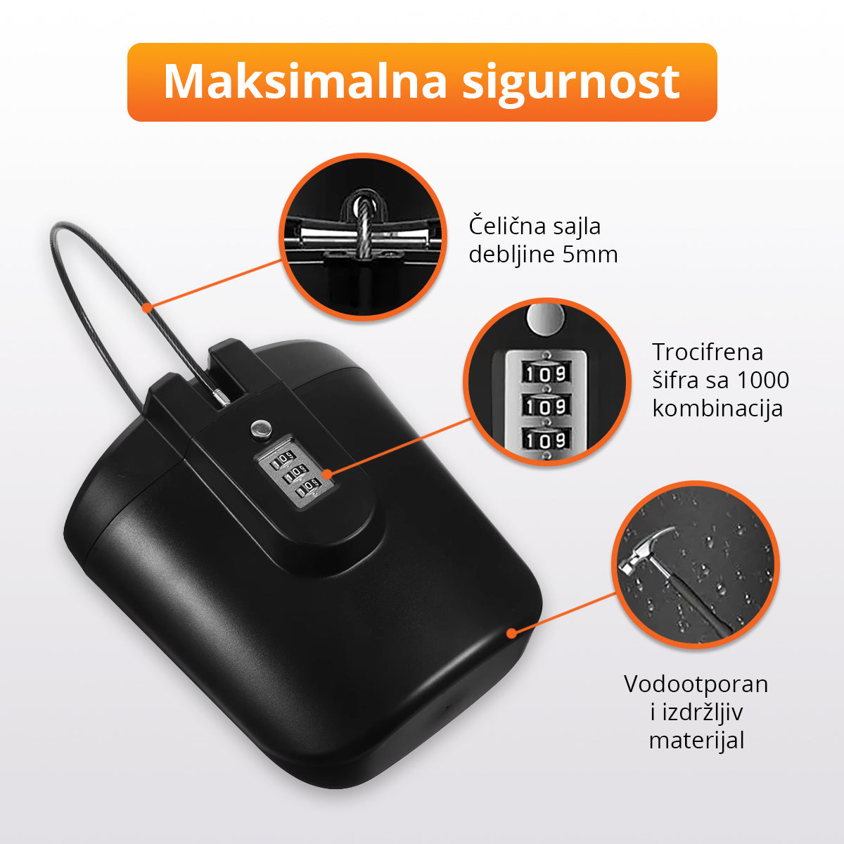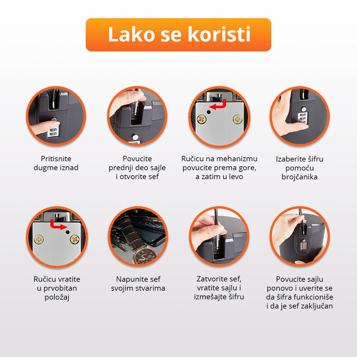 Sef je napravljen od kvalitetne ABS plastike i dovoljno je čvrst da zaštiti Vaše vredne stvari od neželjenih pogleda i ruku. Brava i sajla su napravljene od metala, tako da se ne brinite da će neko “u prolazu” i sa lakoćom doći do Vaših stvari.